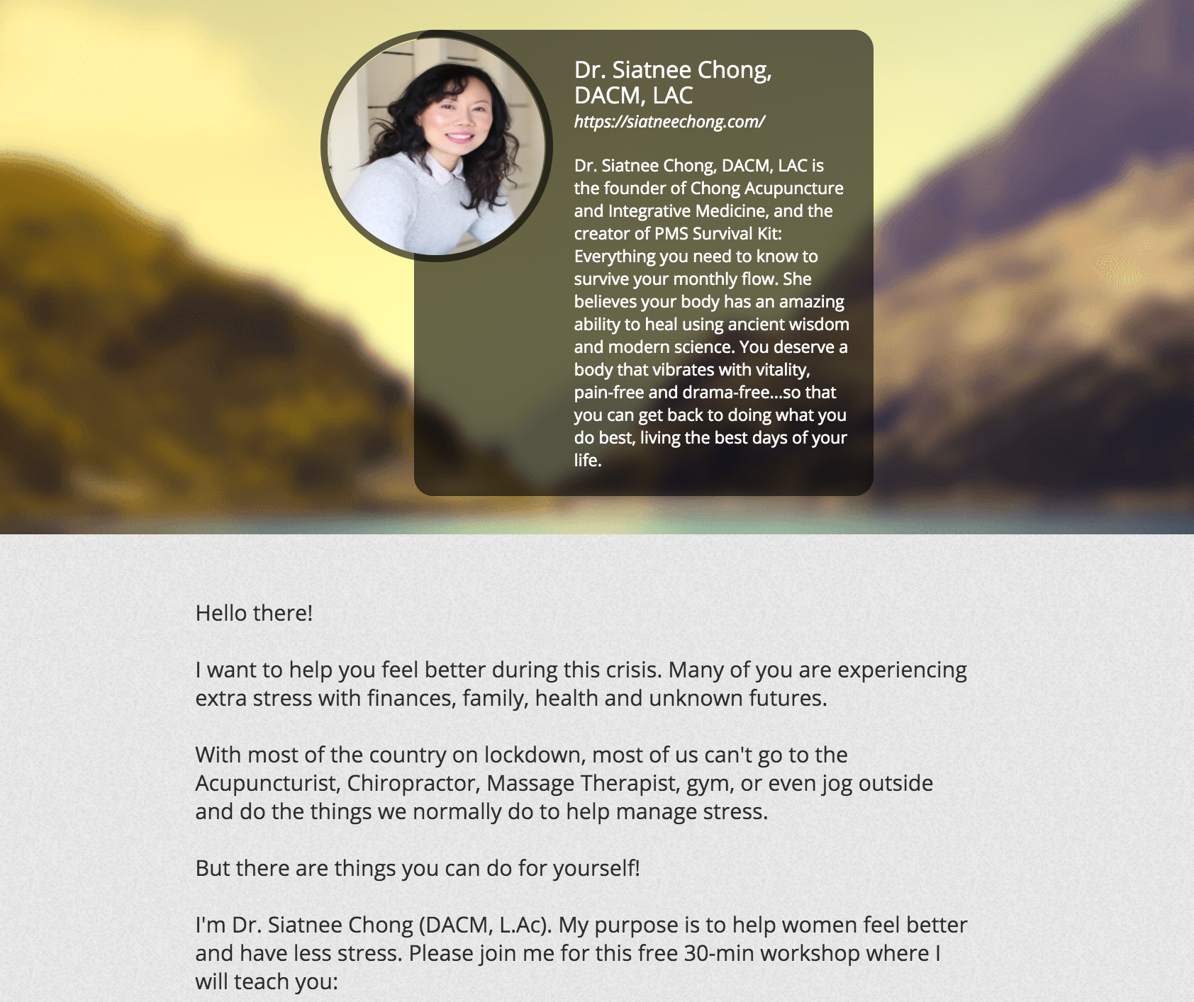 Are you stressing? I would like to help. Join me for my FREE 30-min webinar on managing stress. I will teach you how to use your body and ear acupressure points to relieve stress during stressful times like this crisis.